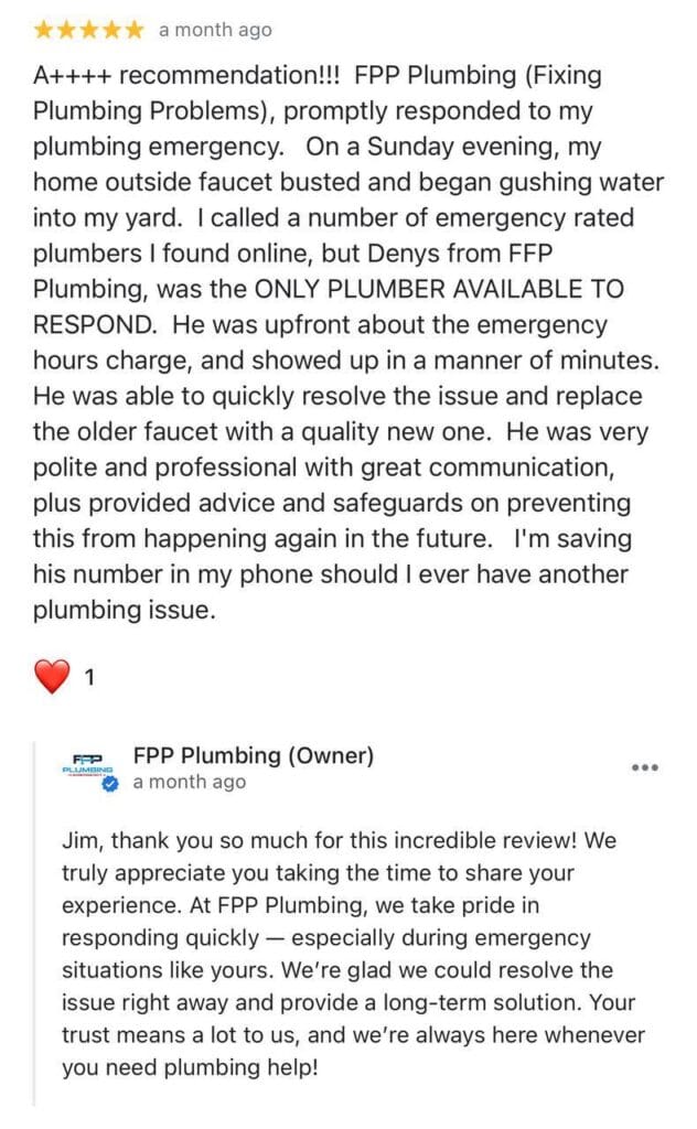 Water heater stopped mid-shower? Toilet won’t flush and guests are on the way?We’re FPP Plumbing – local, licensed, and in your area.